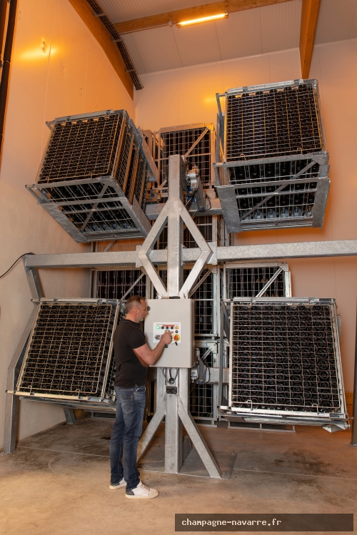 Après la seconde fermentation en bouteille, un dépôt de levures se forme naturellement. Pour obtenir un vin limpide, ce dépôt doit être progressivement rassemblé dans le col de la bouteille. Traditionnellement, les bouteilles étaient placées tête en bas sur des pupitres en bois, puis tournées manuellement chaque jour d’un huitième de tour pendant plusieurs semaines. Aujourd’hui, cette opération est majoritairement effectuée à l’aide de gyropalettes, des machines automatisées capables de remuer plusieurs centaines de bouteilles à la fois avec précision et régularité.